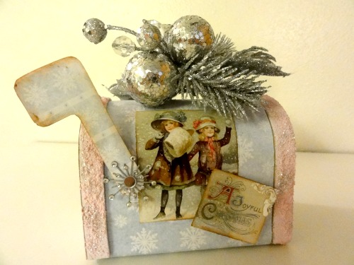 A Christmas gift bag and mini paper mache mailbox using the Children's Christmas Collage and Vintage Christmas Paper Pack from Tweety Jill. The resin angel wings are from Melissa Frances.