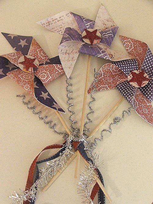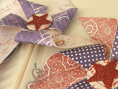 These pinwheels were created using paper from Melissa Frances. I tied the bottom of the sticks with ribbon and tinsel also from Melissa Frances.