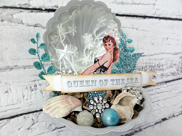 Paint the shell silver and let it dry. Print out the words "Queen of the Sea" using  the Circus font and cut it out banner style. Print out a vintage pin-up girl image and cut her out. I free handed her mermaid tail, (but you can just google mermaid tail images and find one) glued it to her and covered it in glass glitter from Melissa Frances.