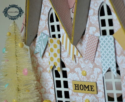 Using enamel dots, I embellished a bottle brush tree and placed it towards the front of the house. I also used banner die cuts to decorate the windows. I embellished the house with a "Home" chipboard element as well as a little chipboard button on the front gate.