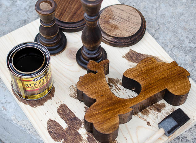 Take the 4" circles, scooter and candlesticks outside to stain. Brush one coat on each wood piece and allow to dry. After all the pieces are dry, take a bit of sandpaper and sand your projects to give them that rustic look.