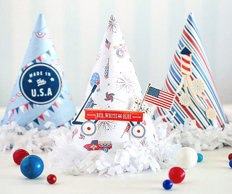 Here are some fun party hats I made for the kids to wear while watching the parade. The hats use paper from Photoplay Paper Main Street Parade Collection and cute stickers from Pebbles Inc.