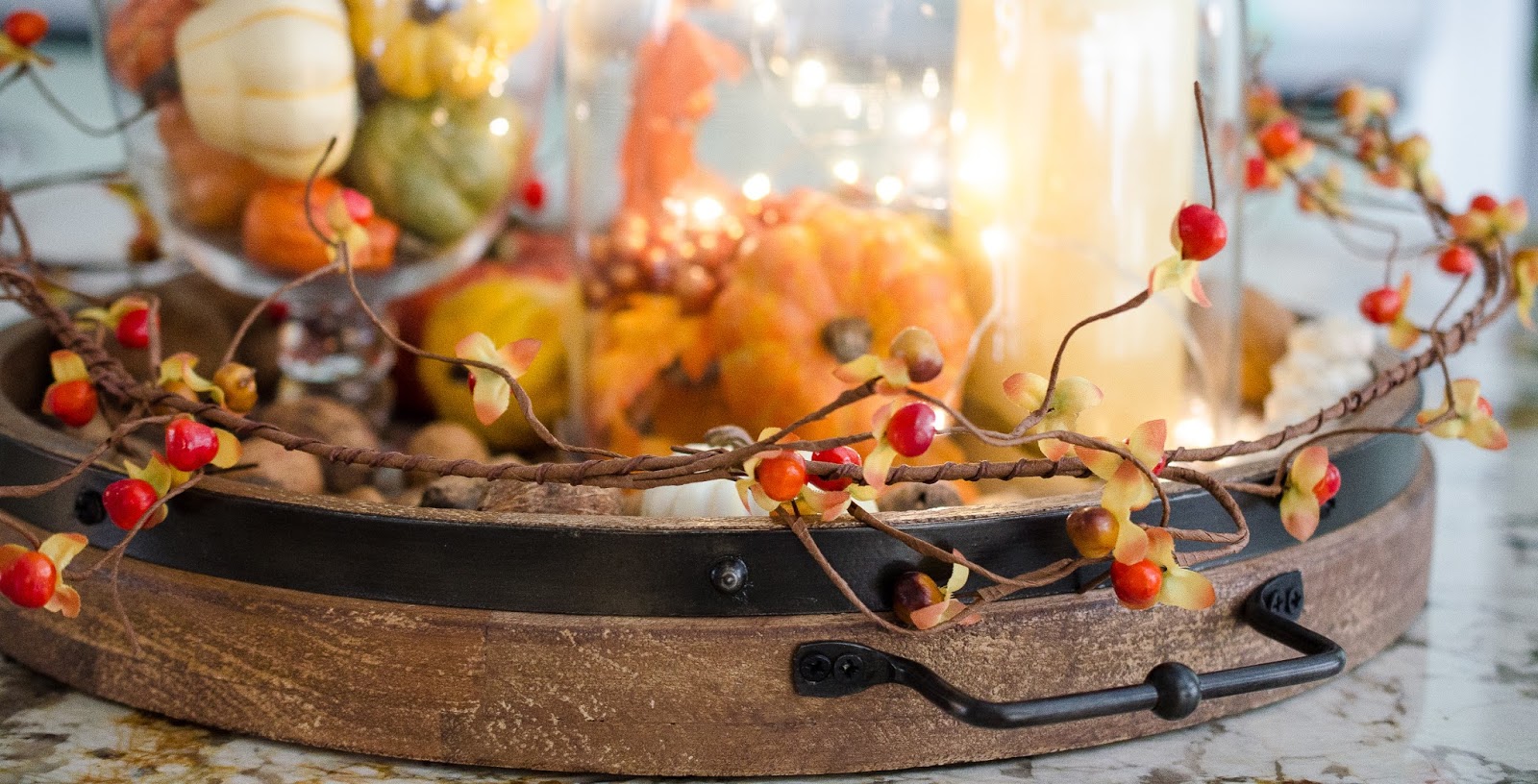Place a rustic wood tray on the counter or on a dining table for small spaces with apothecary jars and a glass cloche. Add natural elements of white and burnt orange mini pumpkins intertwined with sprigs of bittersweet inside the jars.Coil mini string lights through the arrangement for a twinkle of light.